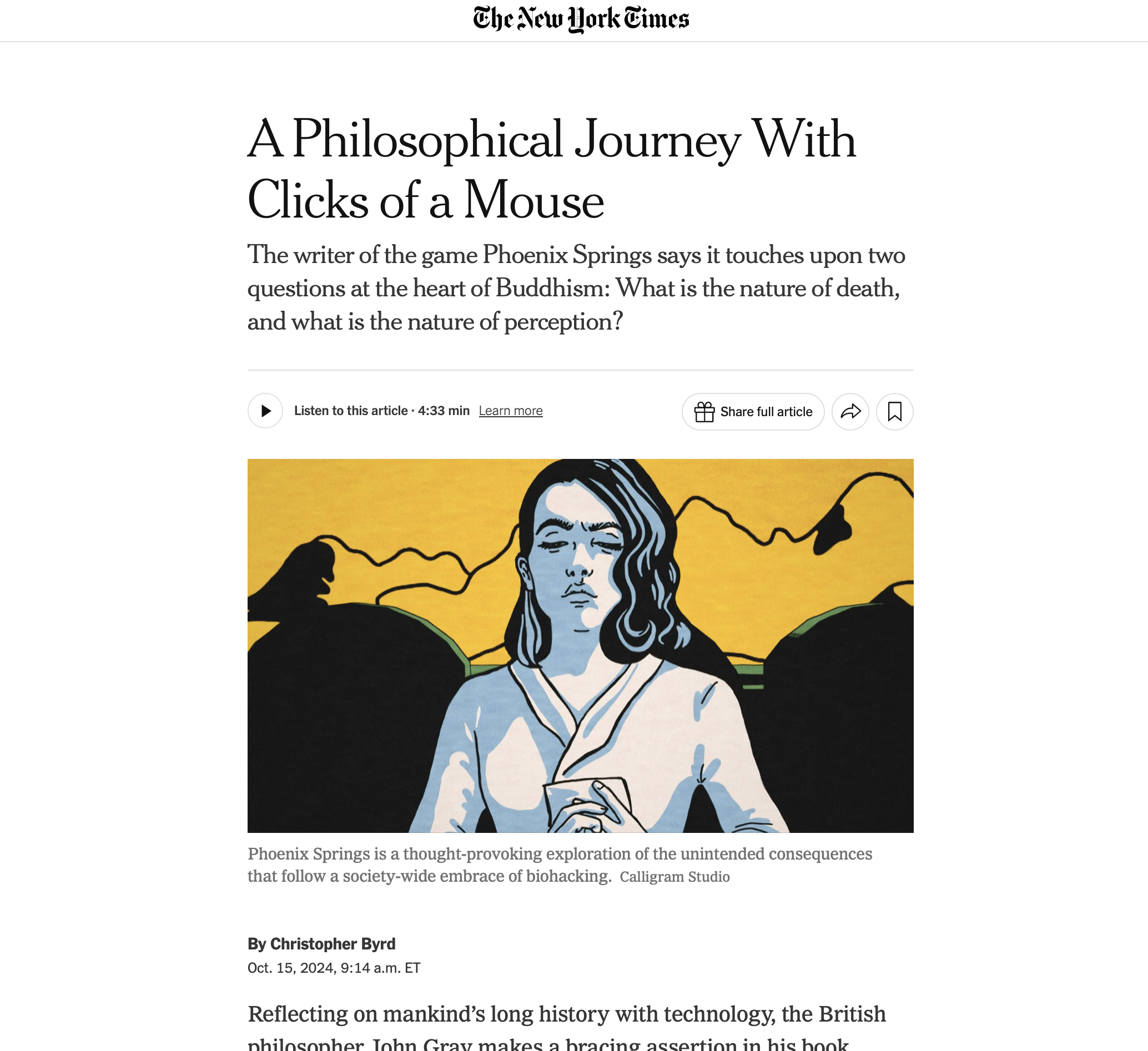 Incredibly proud to announce our feature in the New York Times. It's behind a soft paywall but you can read it here. The chat between Christoper Byrd and Jigmé Özer, writer/designer of Phoenix Springs, explores some of the game's themes and references. Mild spoilers.